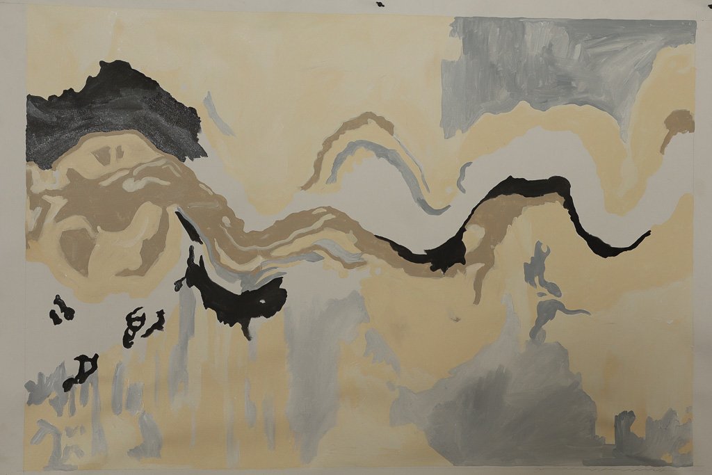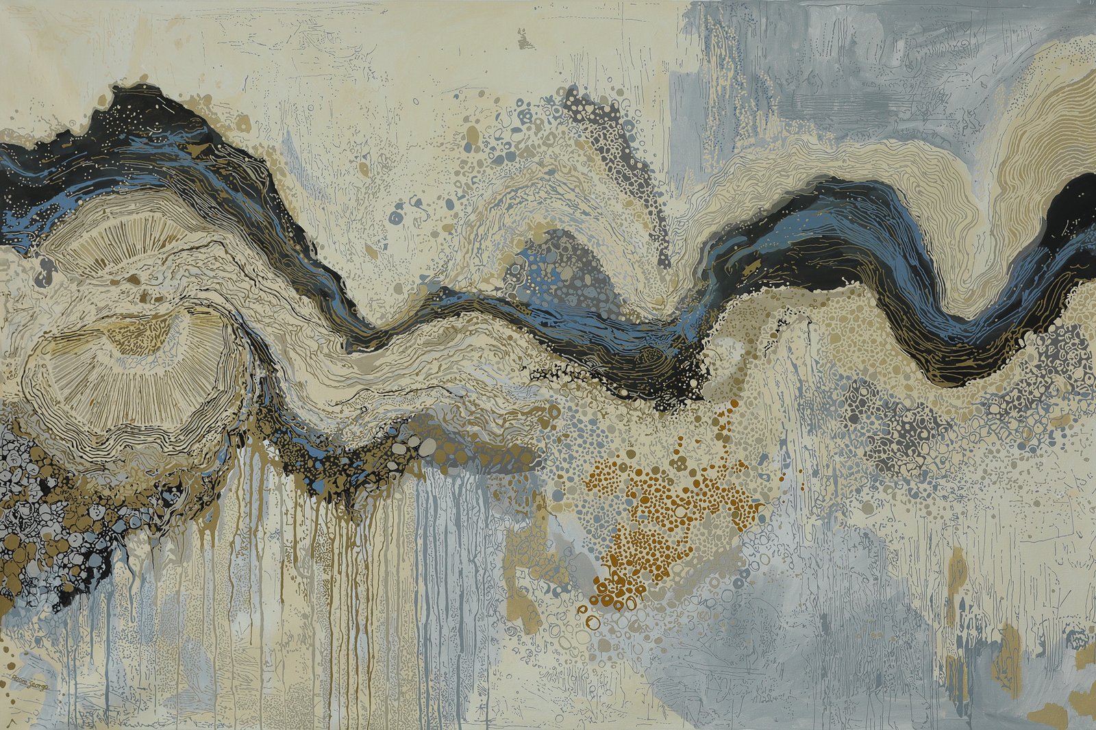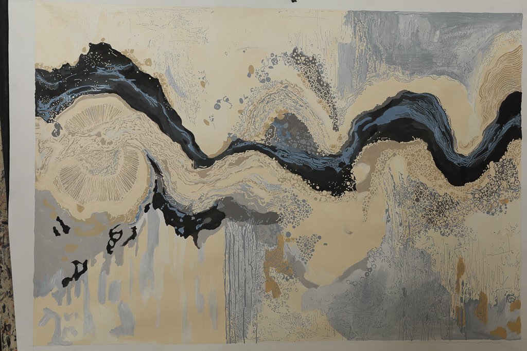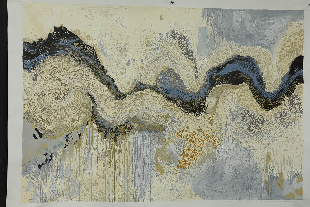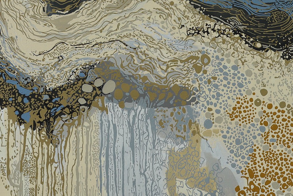 In this work, the flowing line traces that movement… the journey of water as it reconnects the land. Layers of soft blues, greys and ochres echo the shifting surface of the lakes, where sky and earth meet and blur together.