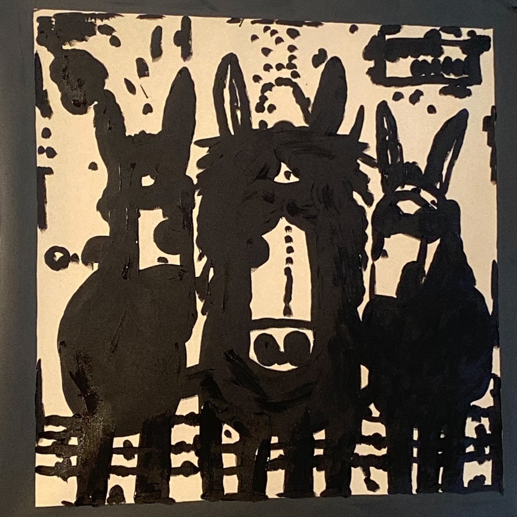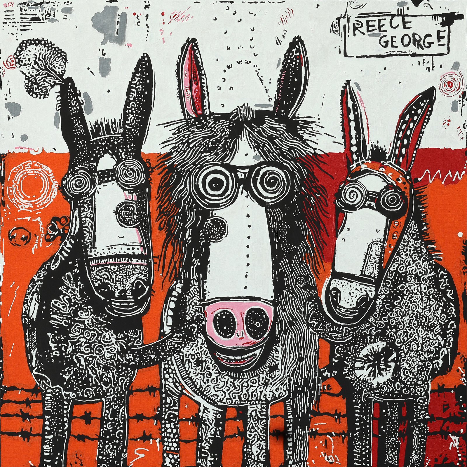 The result is a surface that feels almost embossed… dense with pattern, yet controlled and precise. The spiral spectacles and patterned bridles are painted last, acting as visual anchors that draw the eye back to each face. In a domestic or corporate setting, this balance of graphic punch and meticulous craftsmanship rewards repeated viewing and pairs easily with both contemporary interiors and more traditional collections.