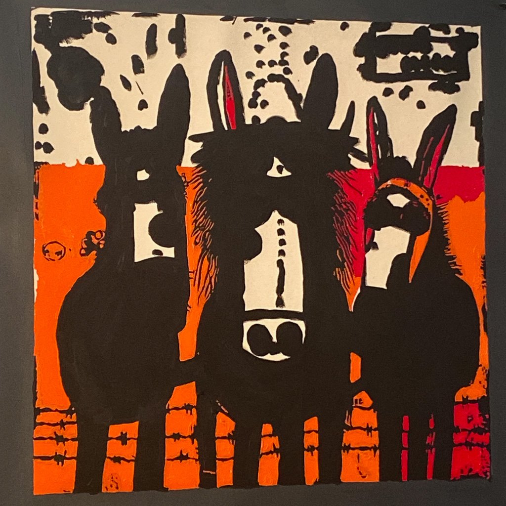 Bessy, Floss and Middy at Beyondie gathers three unmistakable station characters on a single desert stage. In front of a searing band of red–ochre sky, three brumbies stand shoulder to shoulder, their spiral glasses, shaggy manes and tilted ears catching the light like jewellery. The palette is deliberately bold – inky blacks, chalky whites, hot orange and soft blush pink… creating a graphic, contemporary presence that reads as both fine art and joyful storytelling.