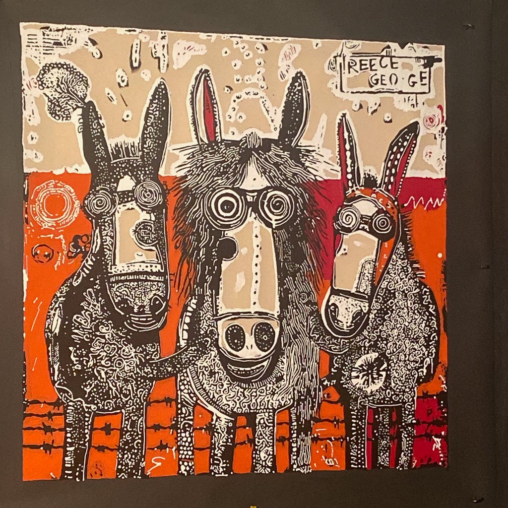 Reece George is a proud Martu artist whose stories are rooted in Beyondie Station… his family’s remote cattle station in Western Desert Country. These three horses are real and remembered as old station companions: Bessy the calm elder, Floss the sharp-eyed gossip, and Middy the wild-haired ring-leader. Their spiral glasses echo campfire stories told late into the night, when everyone leans in and the world tilts slightly with laughter.