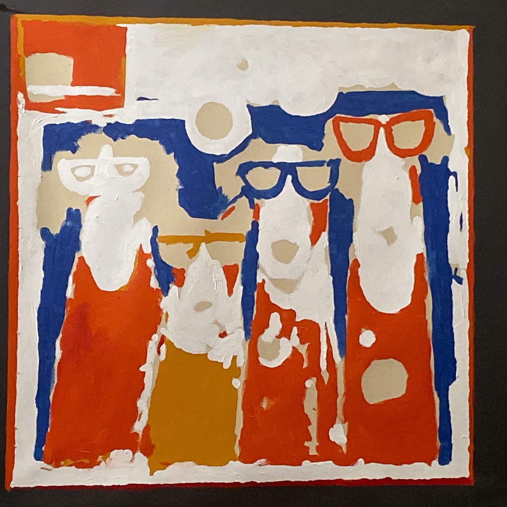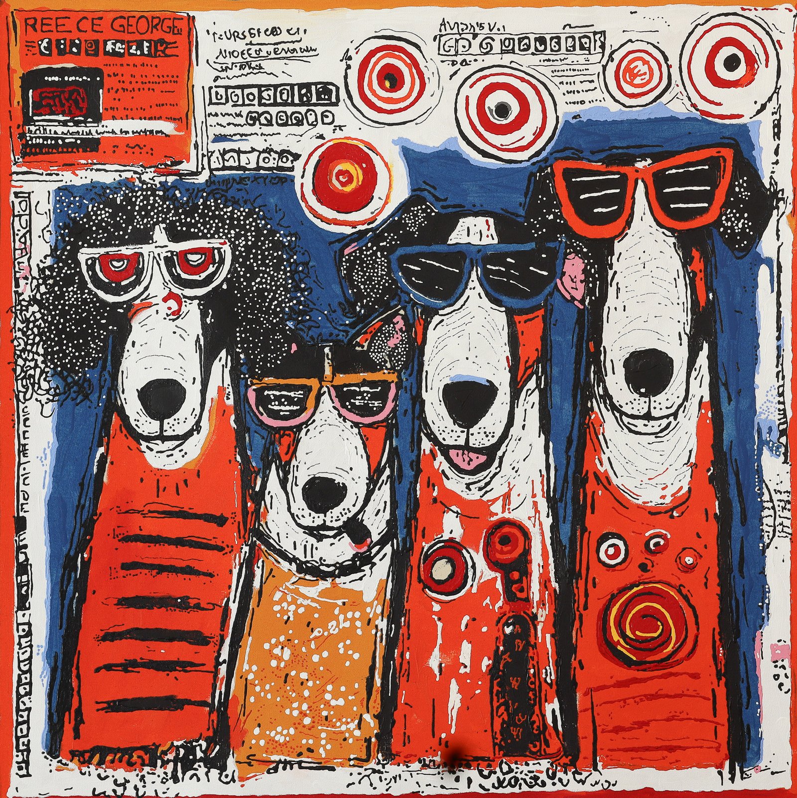 Dingo Groove is an audacious celebration of attitude and identity. Exploding with electric blues, fiery oranges, and deep ochre reds, this painting captures four “cool customers” of the Western Desert. Donning sunglasses and sporting distinct personalities, these dingoes gaze out with a confidence that is both humorous and commanding. The composition… framed by cryptic text and traditional concentric circles… merges the rebellious energy of urban pop art with the deep-rooted storytelling of the Martu people.