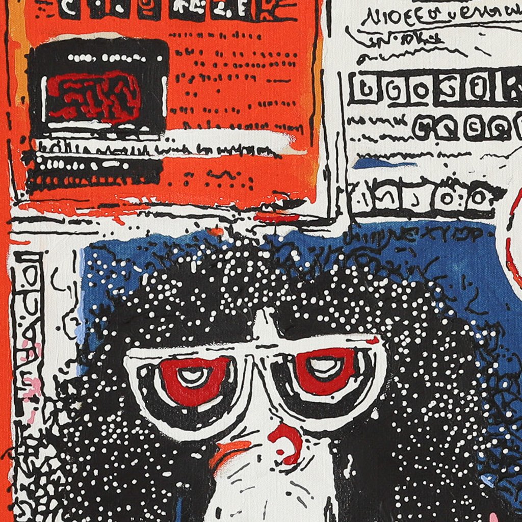 Dr. Reece George’s technique in Dingo Groove demonstrates a masterful evolution of style. He utilizes high-viscosity acrylics on archival canvas to create a surface rich in texture. The background features his signature abstract markings—reminiscent of both ancient rock art and modern street art styles. The inclusion of text elements in the upper corners adds a layer of intellectual intrigue, inviting the viewer to decipher the “visual language” of the artist.