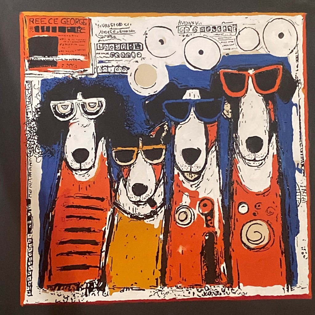 The striking color blocking… particularly the juxtaposition of the cool blue background against the warm, earthy bodies of the dingoes… showcases Reece’s sophisticated understanding of color theory. This is a painting designed to dominate a room, drawing the eye and holding it with its intricate details and bold forms.