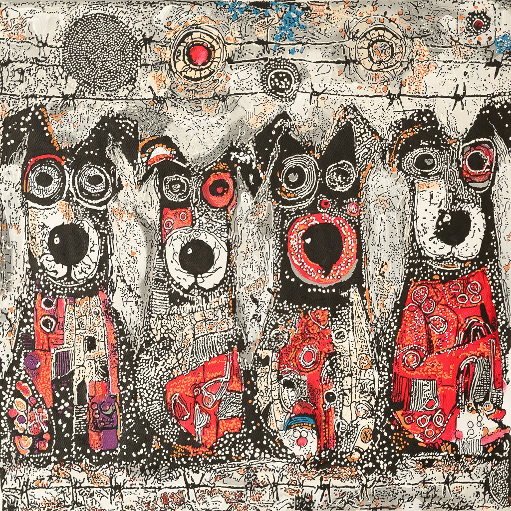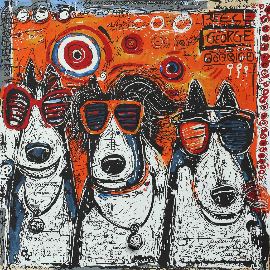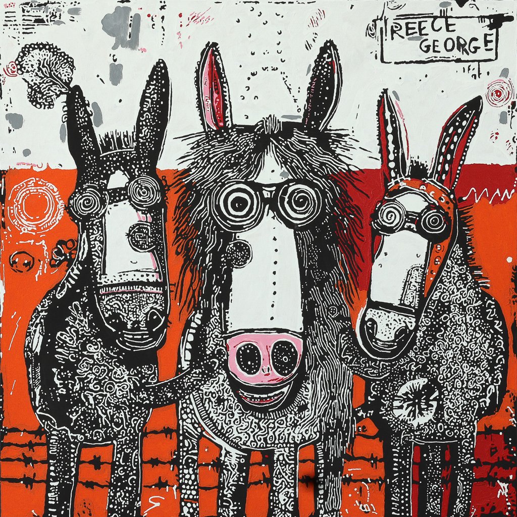 Dr. Reece George is a contemporary Martu artist whose canvases bridge ancient desert heritage and modern vibrancy1. Raised on his family’s Beyondie Station in Western Australia, George infuses each work with the red earth, ancestral stories and boundless sky of Martu Country. His bold acrylic paintings teem with lively characters… dingoes in sunglasses, cheeky rabbits by the fence-line, and emus full of attitude… all rendered in a warm palette of ochres, blacks and fiery reds1. These compositions “weave Indigenous storytelling with a modern aesthetic1”, marrying meticulous dot-work and texture with joyful humor. Collectors prize George’s art for its genuine cultural grounding and emotional depth: as one biography notes, buyers value his work for its “cultural grounding and joyful appeal”.