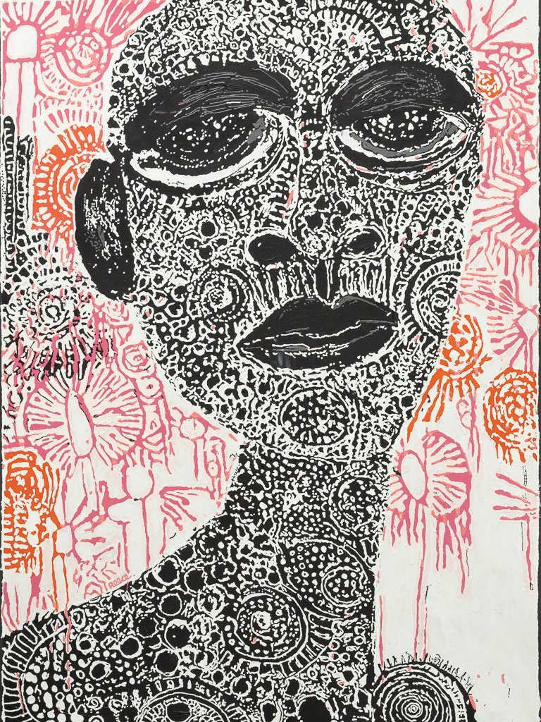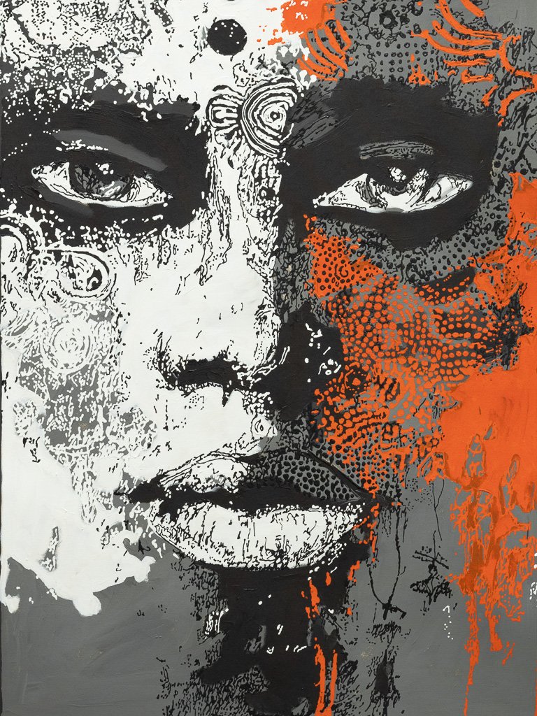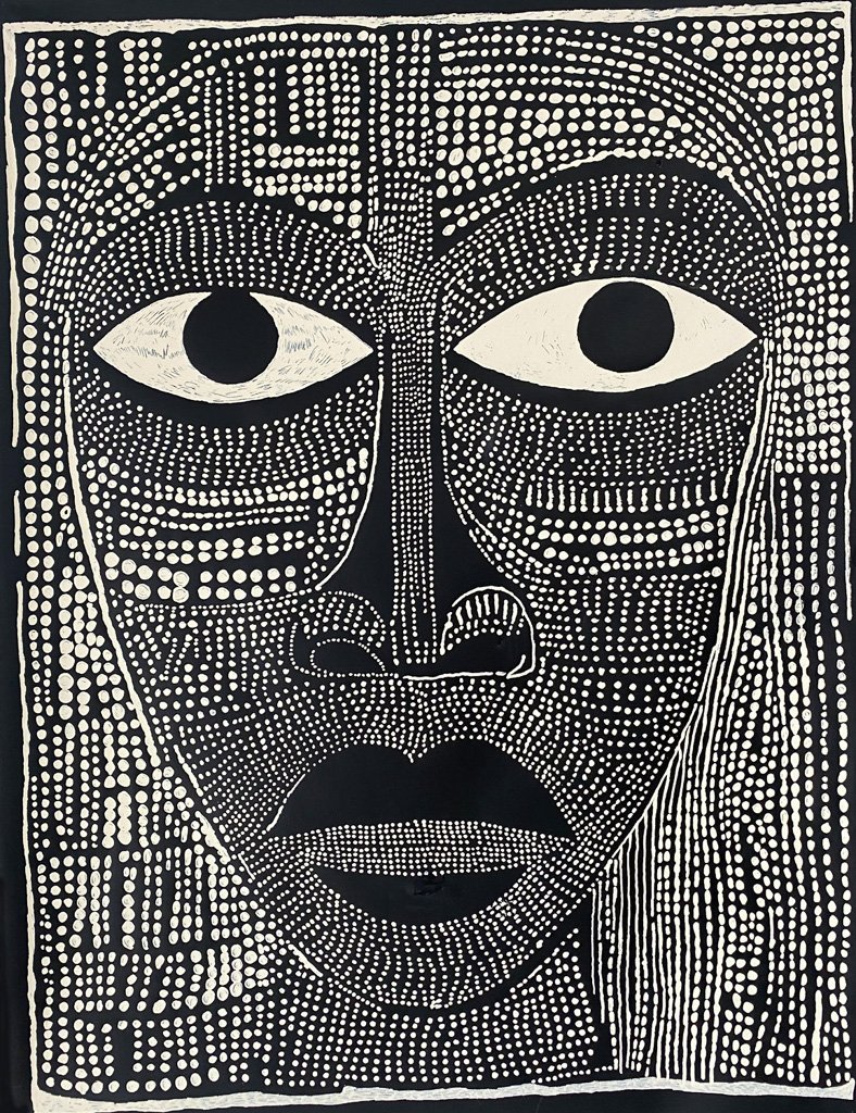 Martu Faces: A reverent portrait series honoring ancestors and elders. In these canvases, strong Martu figures stare out from layers of dot-work and shadow. Each face… crafted from thousands of tiny dots… carries the quiet dignity of leadership and memory. George describes this work as an exploration of “strength, resilience, and identity through portraiture”. The effect is deeply spiritual: the paint glows with the weight of history, as if every brushstroke were a barefoot step across the warm sand of his homeland. These poetic portraits preserve family legacy and cultural knowledge, making Martu Faces a truly legacy-worthy series.