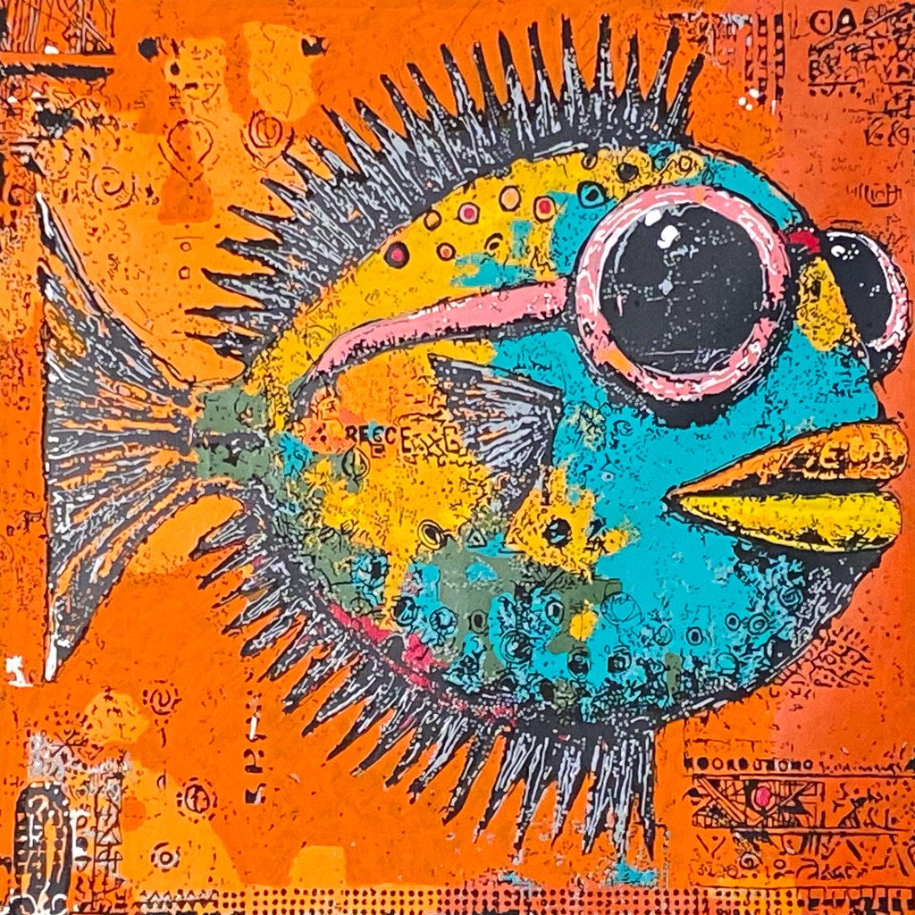 Desert Surf Club: A joyful visual oasis where the arid landscape is playfully reimagined as a surf playground. In this series, drought-hardened wildlife come to life amid ephemeral floodwaters… as if riding the rare rains on Beyondie Station’s claypans. George layers bold strokes and rich dot-work to create lush, original scenes: desert fish swimming among muddy ochre waves under a blazing sky, symbolizing renewal and the levity of community. These vibrant paintings echo his memory of the desert after the rain “like a giant sea of colour”.
