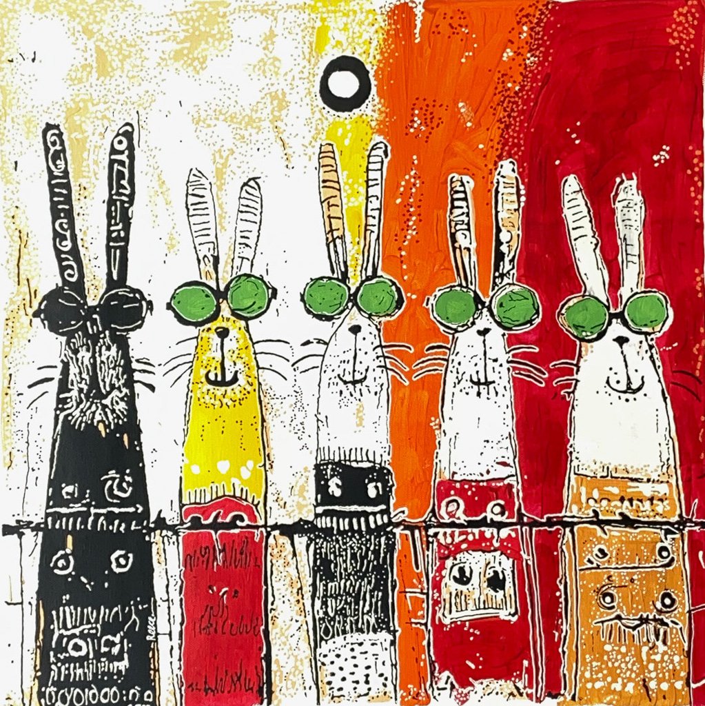 Rabbit Proof Fence: A sophisticated meditation on boundaries, gathering and resilience. The iconic fence that once ran near his home becomes a stage for community and quiet defiance. Here, anthropomorphic characters… notably the cheeky rabbits from his childhood stories… peer through and even perch atop the fence, infusing it with wit and survival instinct. In George’s hands the fence is not a barrier but a gathering place: each rabbit or dingo is a portrait of endurance and cultural joy, a subtle commentary on resistance. These paintings are rendered in shimmering textures and earthy hues, celebrating life’s lighter side even in harsh country1.