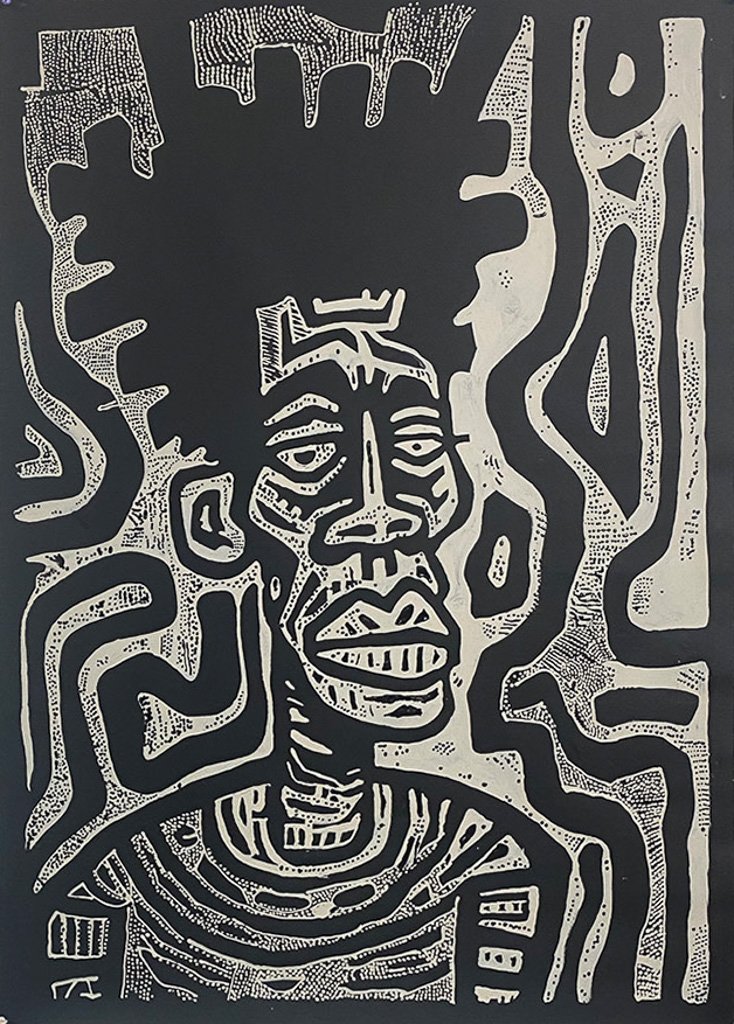 A powerful portrait layered with swirling textures, deep shadows and vibrant ochre. The face emerges through intricate patterns… spirals, markings and fine-grained linework… creating a sense of memory held in every surface. The intense gaze and richly worked background give the work a profound presence, honouring the role of the storyteller as a keeper of wisdom, culture and lived experience.