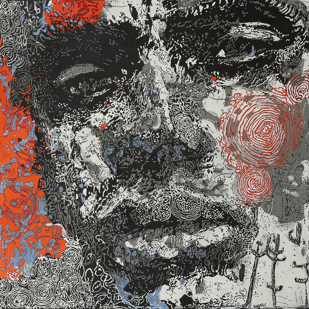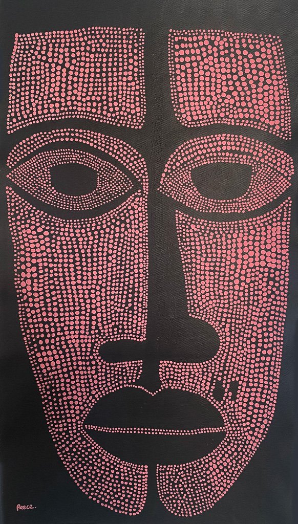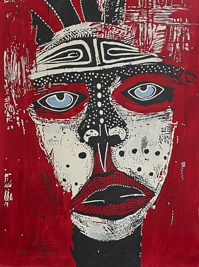 A striking portrait alive with intricate markings and layered symbols, Echo of the Red Sky captures the warmth and intensity of a desert sunset. The face, built from dense black-and-white patterning, is surrounded by radiant reds and soft pinks… forms that suggest light, memory and ceremony. The work carries a powerful presence, unfolding like a story etched across skin and sky.
