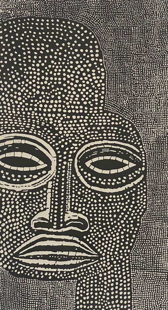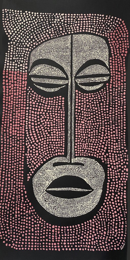 Formed from soft cream and pink dot-work over deep black, Martu Man (Jack) carries a calm, meditative presence. His long nose, closed eyes and gently shaped lips give the portrait a feeling of stillness and introspection. The surrounding field of dots flows like a patterned cloak, adding warmth, texture and a quiet sense of cultural depth.
