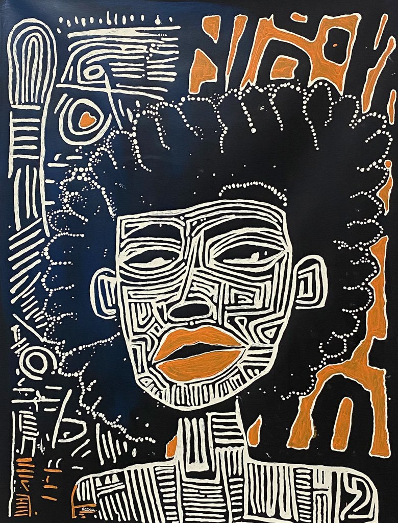A powerful portrait rendered in bold black and sand tones, Martu Man captures the strength and quiet intensity of an elder figure. Sharp lines, carved features and intricate dot-work sweep across the face and surrounding forms, evoking the deep currents of story, memory and Country. The work carries a strong presence… dignified, contemplative, and unmistakably grounded in culture.
