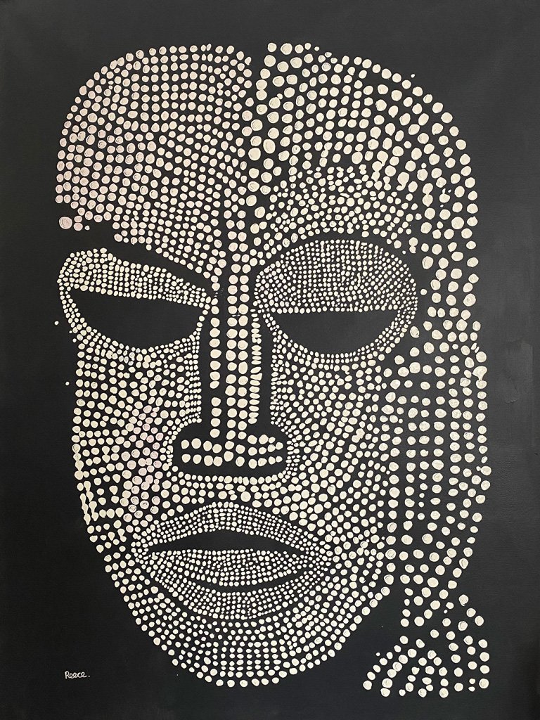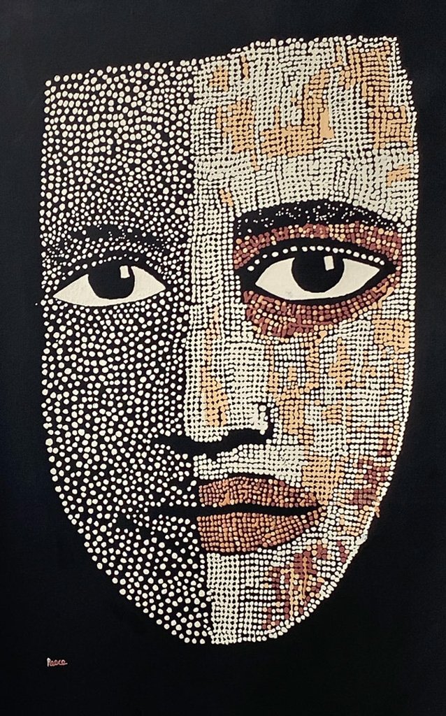 Composed entirely in fine, deliberate dots, Martu Man (Billy) presents a calm, grounded presence emerging from deep black. The face is built with rhythmic precision… soft curves, heavy-lidded eyes and a quiet strength held in the lips and brow. The simplicity of the palette highlights the detail and patience in the mark-making, creating a contemplative portrait that feels both ancestral and immediate.