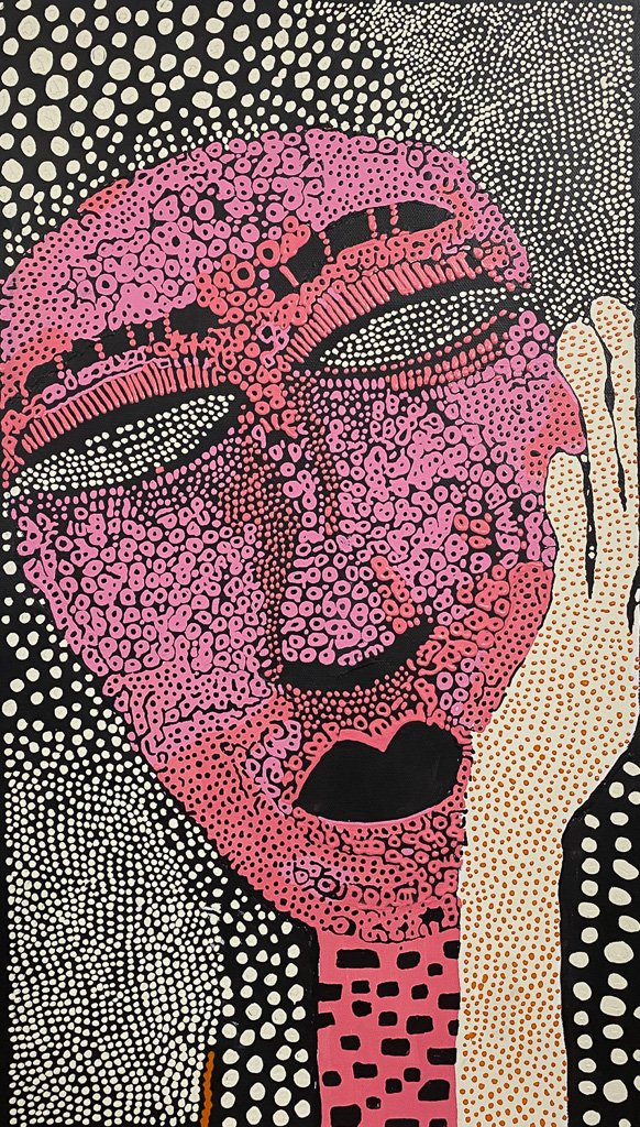 Soft pinks and intricate dot-work shape the gentle, introspective expression of Martu Woman (Milli). Her resting pose, half-closed eyes and the hand supporting her face create a feeling of quiet reflection. Patterns shift from dense clusters to open fields, giving the portrait a rhythmic, breathing quality… tender, thoughtful and deeply connected to Country.